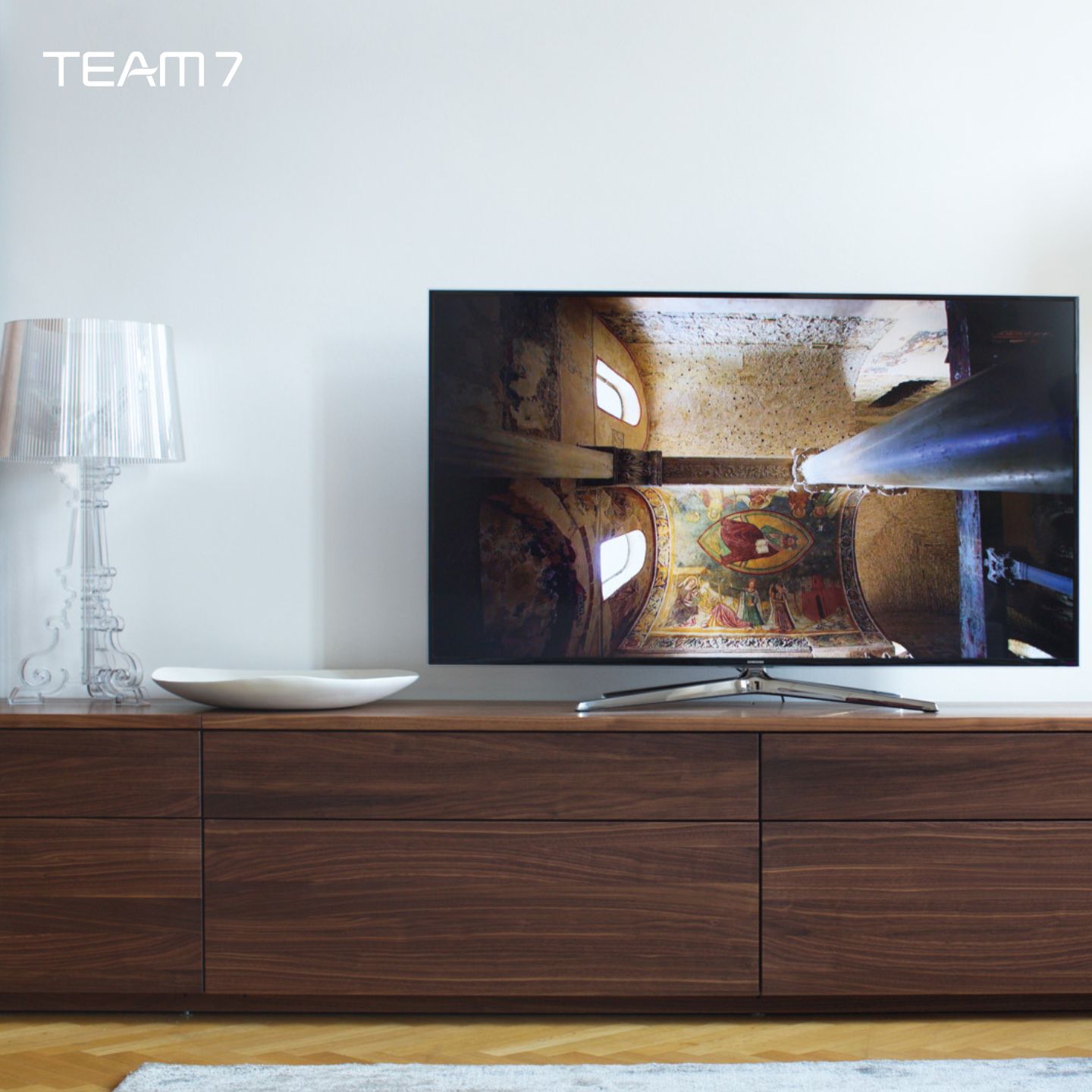 Gleichzeitig lieben wir die klare, geradlinige Formensprache: Sie wirkt architektonisch, ohne kühl zu werden, und lässt Naturholz bewusst im Mittelpunkt stehen. Der Entwurf von Sebastian Desch setzt auf präzise Flächen und eine Ordnung, die Räume „leiser“ macht – gerade dann, wenn im Wohnzimmer viel passiert: Bildschirm, Lautsprecher, Bücher, Deko, Familienleben.