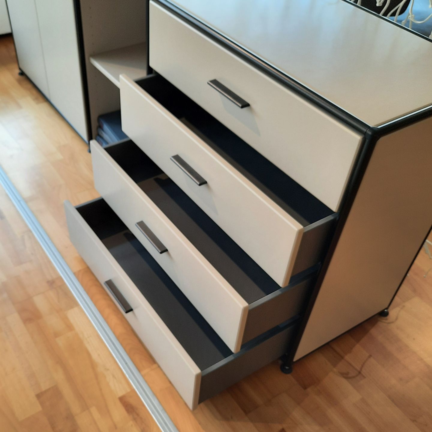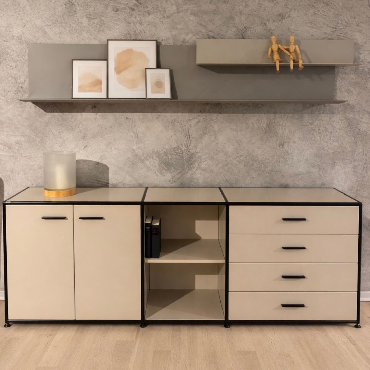 Links 2 Türen, innen mit 1 Einlegeboden, mittig offen mit 1 Einlegeboden, rechts 4 gleich hohe Schübe
