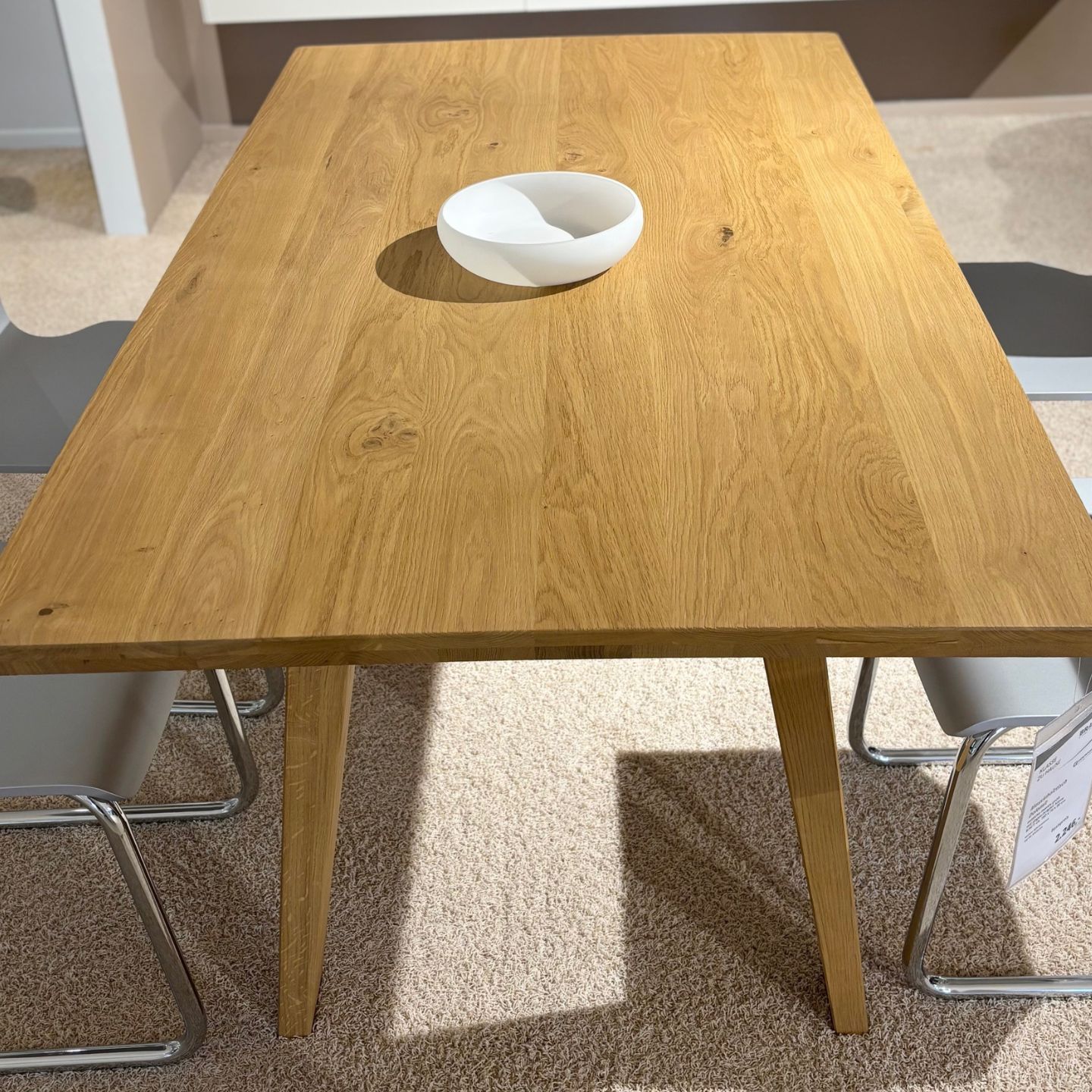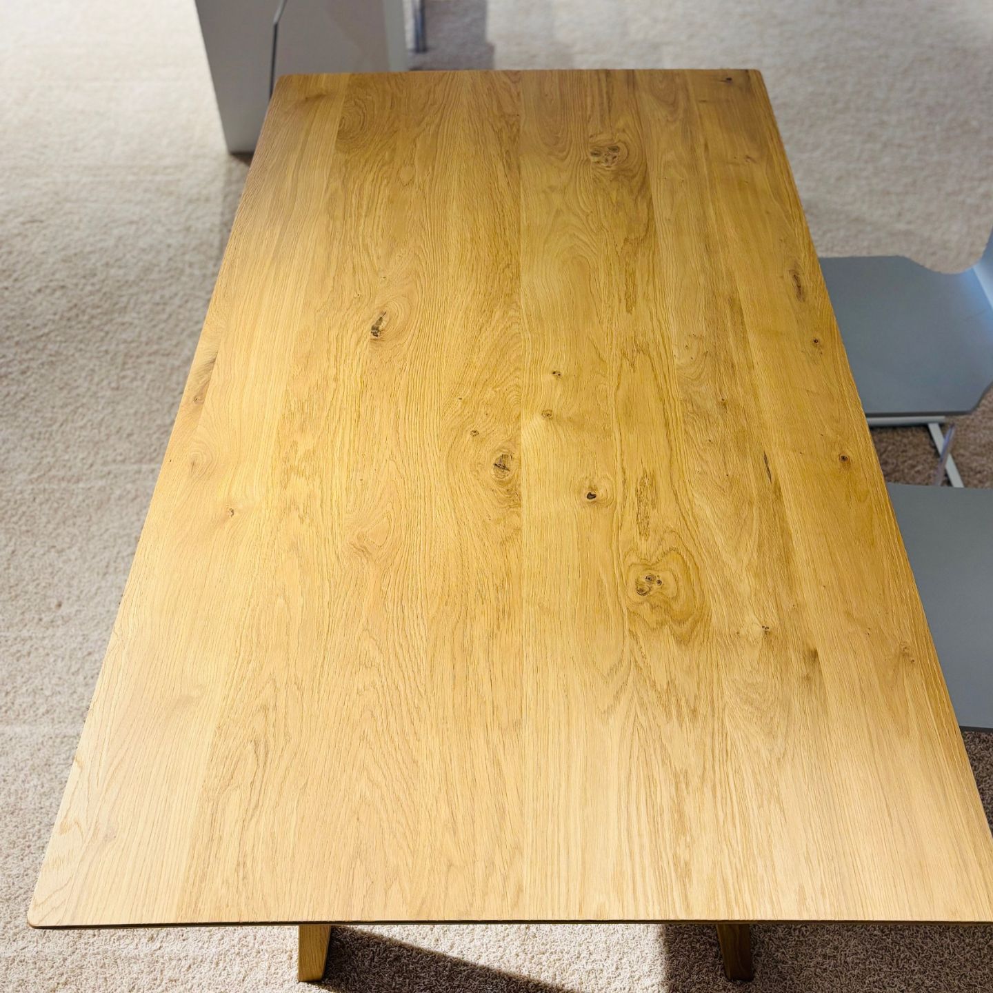 Ein rechteckiger Dolomit-Esstisch mit natürlicher Holzoberfläche steht auf einem beigen Teppich, auf der rechten Seite sind zwei graue Stühle teilweise sichtbar.
