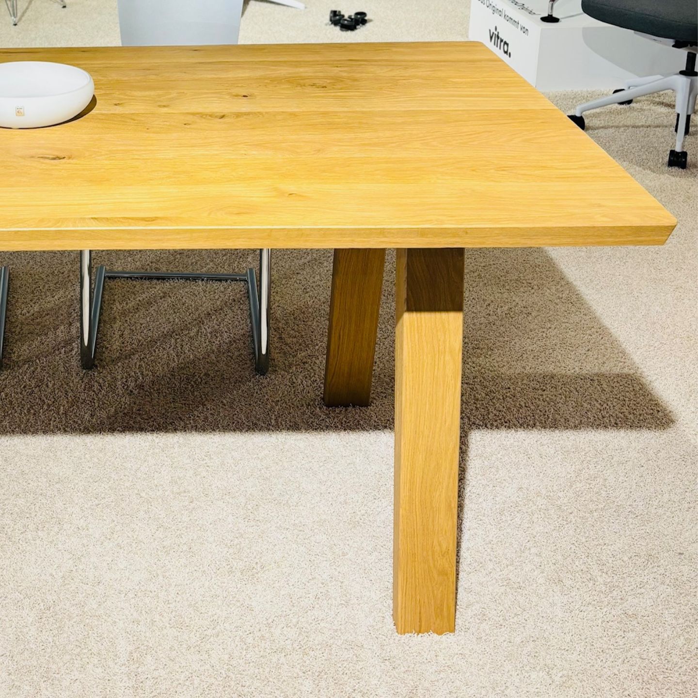 Rechteckiger Dolomit Esstisch mit dicken Holzbeinen auf einem hellen Teppich; im Hintergrund ist ein Teil eines weißen Stuhls und ein minimalistischer Dekorationsartikel zu sehen.