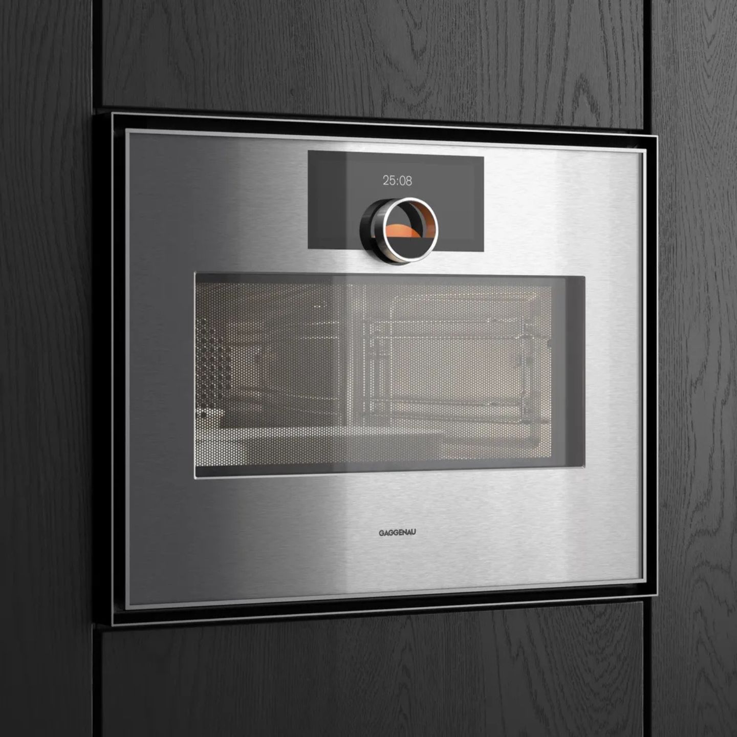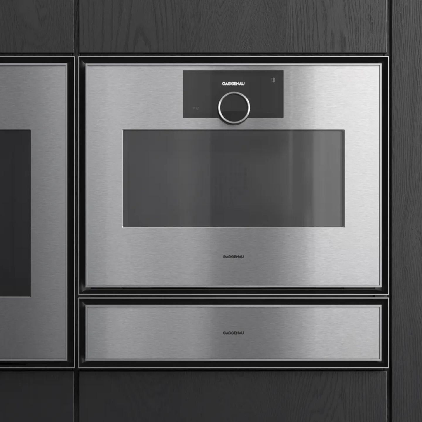 Die Bedienung erfolgt über das gleiche interaktive Display mit Edelstahlring. Programme wie „Auftauen“, „Regenerieren“ oder „Backen mit Mikrowelle“ sorgen für perfekte Ergebnisse. Auch beim Design bleibt Gaggenau seinem Prinzip treu: elegante Materialien, klare Linien, höchste Verarbeitungsqualität.