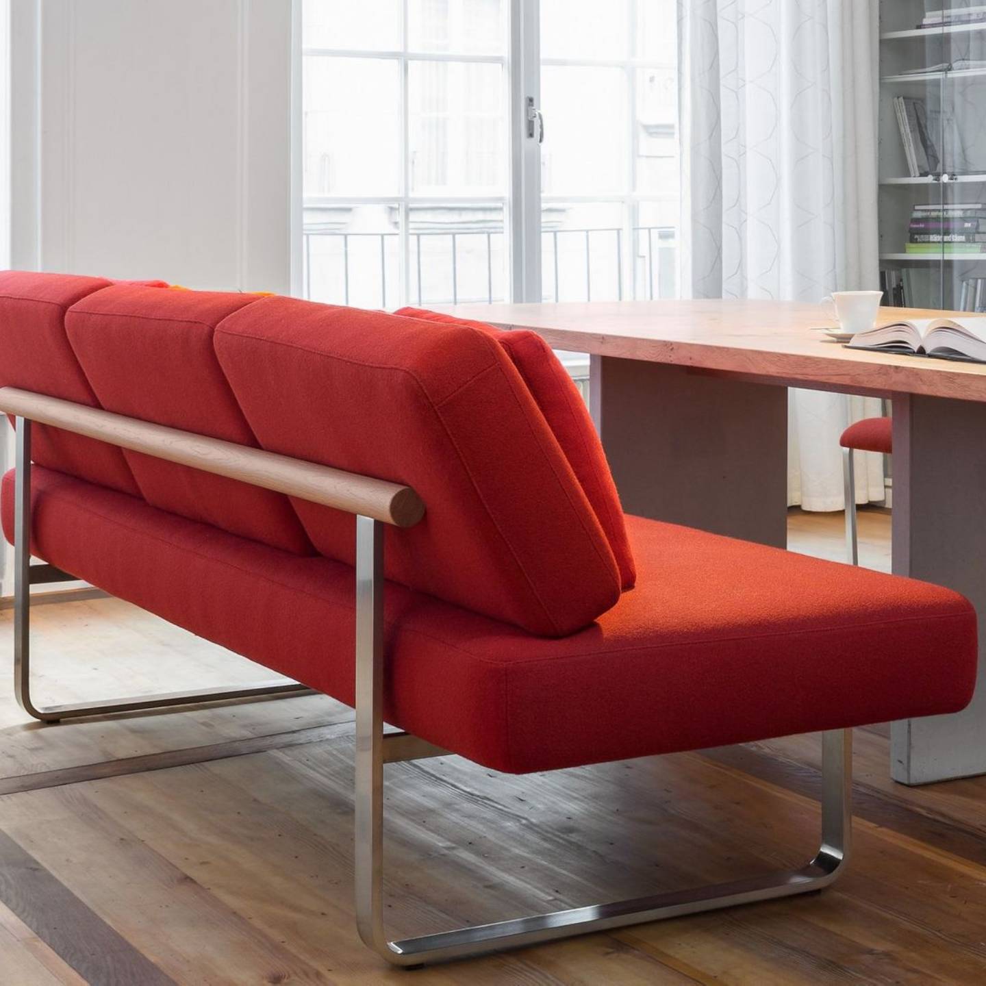 Die Girsberger Sitzbank Joline verbindet elegantes Design mit höchstem Sitzkomfort. Entwickelt von Mathias Seiler, interpretiert sie das klassische Konzept der Esszimmerbank neu – als wohnliches Dining-Sofa mit weichen, flauschigen Kissen und einer charakteristischen Holzreling. Diese verleiht den frei beweglichen Rückenkissen Stabilität und bildet zugleich ein markantes Gestaltungselement.