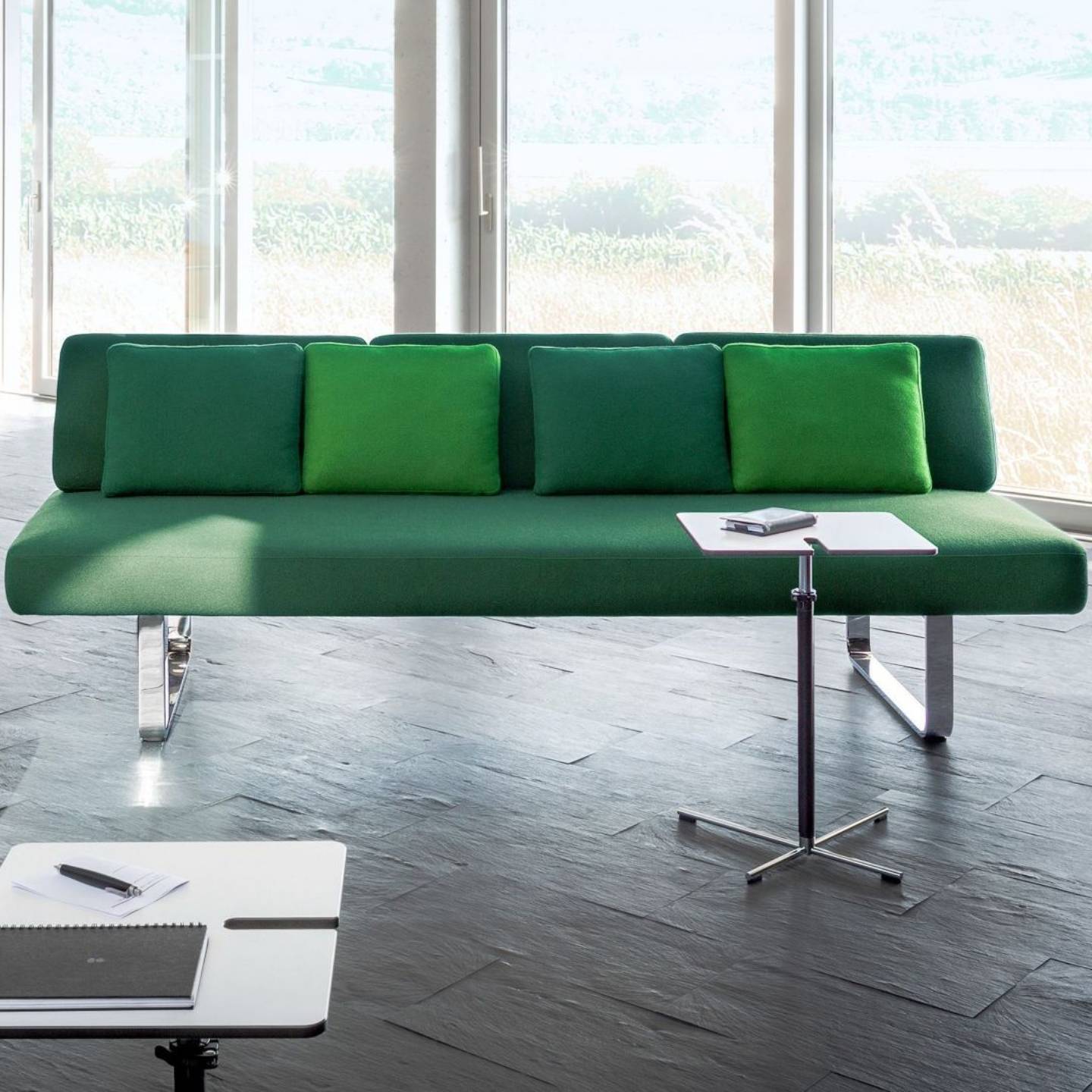 Joline ist in drei Längen als Drei- oder Viersitzer erhältlich und kann individuell konfiguriert werden – mit Gestellvarianten in Anthrazit, Chrom oder Nickel sowie Reling aus Eiche natur oder Buche schwarz gebeizt.