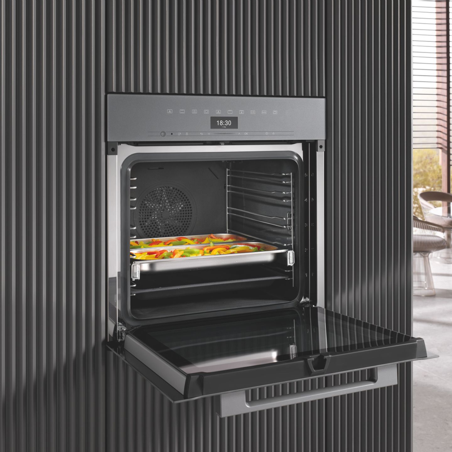 Dieser Einbaubackofen bietet mit seinem großen Garraum, der Pyrolyse-Selbstreinigung und Funktionen wie Heißluft Plus, Klimagaren und TasteControl die perfekte Ergänzung zum Dampfgarer mit Mikrowelle.