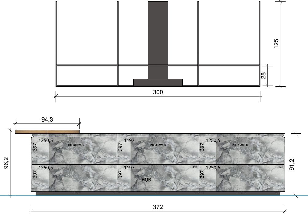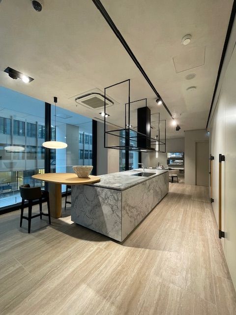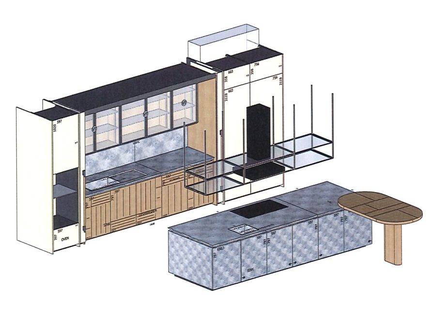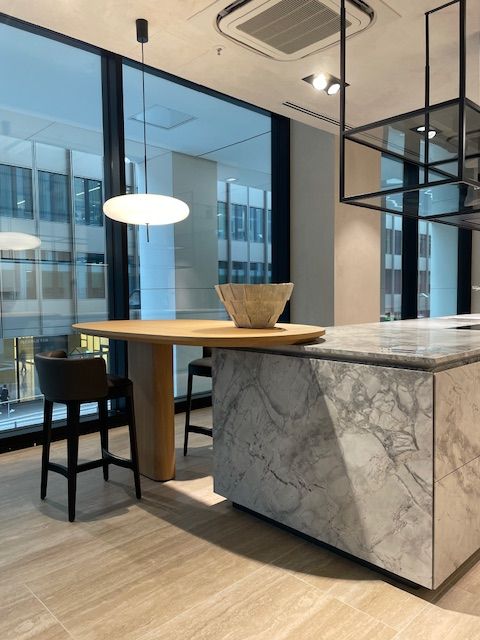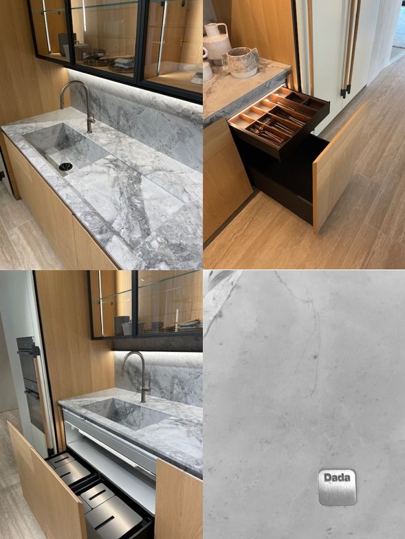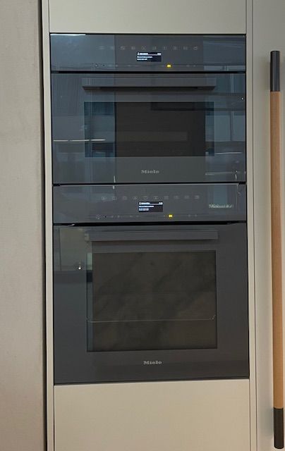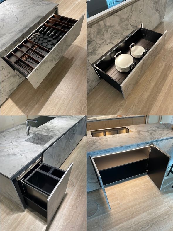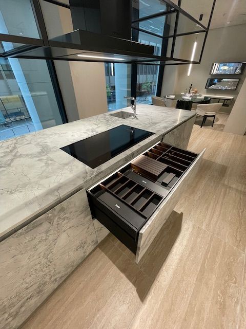 Die Insel verfügt über ein Induktionskochfeld Miele KM78971FL2, eine integrierte Marmor-Spüle und ein zweites Abfallsortiersystem. Der an die Insel angeschlossene Snack-Tisch aus Eichenfurnier Sunrise mit Intarsien (180 x 95 x H 96 cm) schafft einen geselligen Bereich, der sich ideal für das Frühstück oder eine schnelle Mahlzeit eignet. Die Dunstabzugshaube ist ein Molteni&C-Modul, das in eine Designer-Hängewand mit den Maßen 300 x 60 x H 125 cm integriert ist und zur klaren Ästhetik und Funktionalität der Küche beiträgt. Die auf den Bildern gezeigten Barhocker sind nicht im Angebot enthalten. Um die Sicherheit und Qualität des Produkts zu gewährleisten, ist eine professionelle Montage erforderlich. Dieser Service ist nicht im Preis inbegriffen und wird separat in Rechnung gestellt.