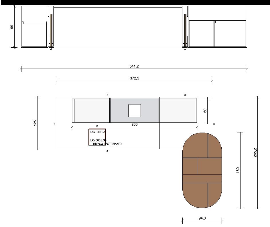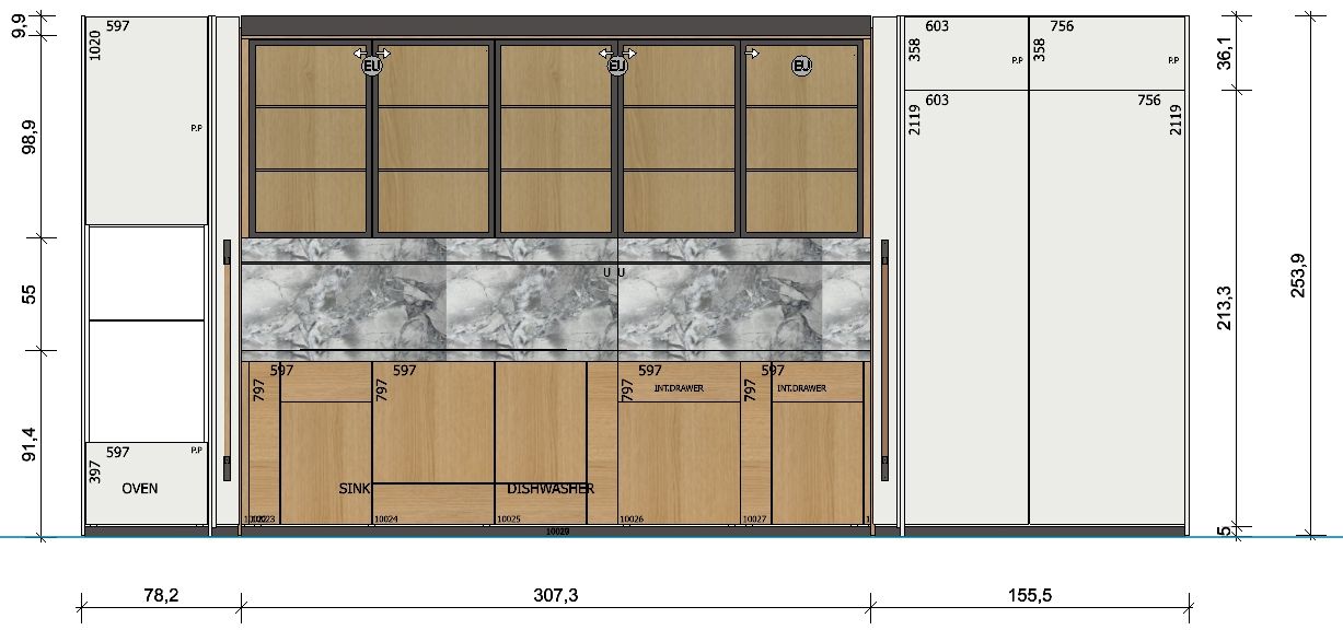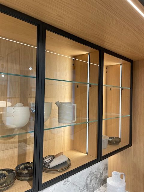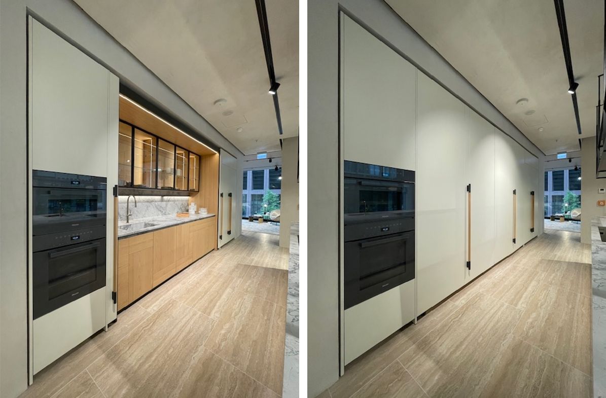 Eine hochwertige Küche mit raffiniertem und zeitgemäßem Design, gefertigt aus erstklassigen Materialien und mit modernsten technischen Lösungen. Oberflächen aus Sunrise-Eiche, mattem Perle-Lack, Klarglas und SuperWhite-Marmor verbinden sich harmonisch zu einem exklusiven Raum, in dem Ästhetik und Funktionalität ihren Höhepunkt erreichen. Die Komposition gliedert sich in zwei Hauptelemente: einen Küchenblock und eine Insel mit Snack-Tisch. Der Küchenblock mit den Maßen 541 x 99 x H 255 cm verfügt über Fronten und Schiebetüren aus mattem Perle-Lack sowie Elemente aus Sunrise-Eichenfurnier mit passenden Einlagen und Zierleisten. Er verfügt über eine integrierte XXL-Spüle und die Rückwand ist vollständig mit SuperWhite-Marmor verkleidet. Die Hängeschränke sind mit Innenbeleuchtung, Klarglas-Türen mit Metallrahmen in Zinnoptik, Glasböden und einer Innenverkleidung aus Edelstahl ausgestattet. Die Küche verfügt außerdem über ein Abfalltrennsystem und eine komplette Ausstattung mit hochwertigen Geräten: Backofen Miele H7460BPGRGR1, Dampfgarer Miele DGM7440GRGR, Geschirrspüler Miele G7280SCVIED1, Kühlschrank Liebherr Monolith EKB 9471 und Gefrierschrank Liebherr Monolith EGN 9271. Die 373 x 125 x 91 cm große Kücheninsel ist vollständig mit SuperWhite-Marmor verkleidet, einschließlich der Rillen, und bietet hinter Flügeltüren und in Schubladen mit Holzaccessoires für die Organisation von Besteck, Tellern, Töpfen und Pfannen, die mit einer integrierten Innenbeleuchtung ausgestattet sind, reichlich Stauraum.