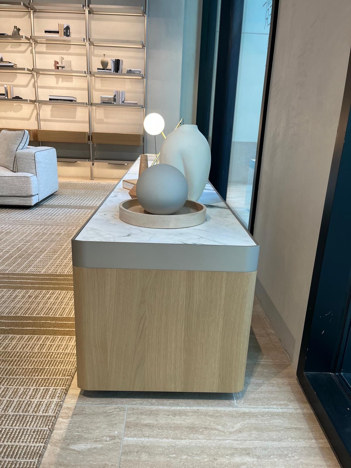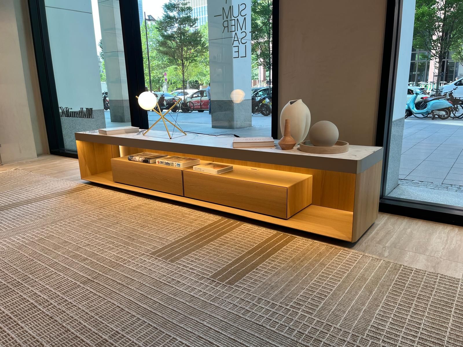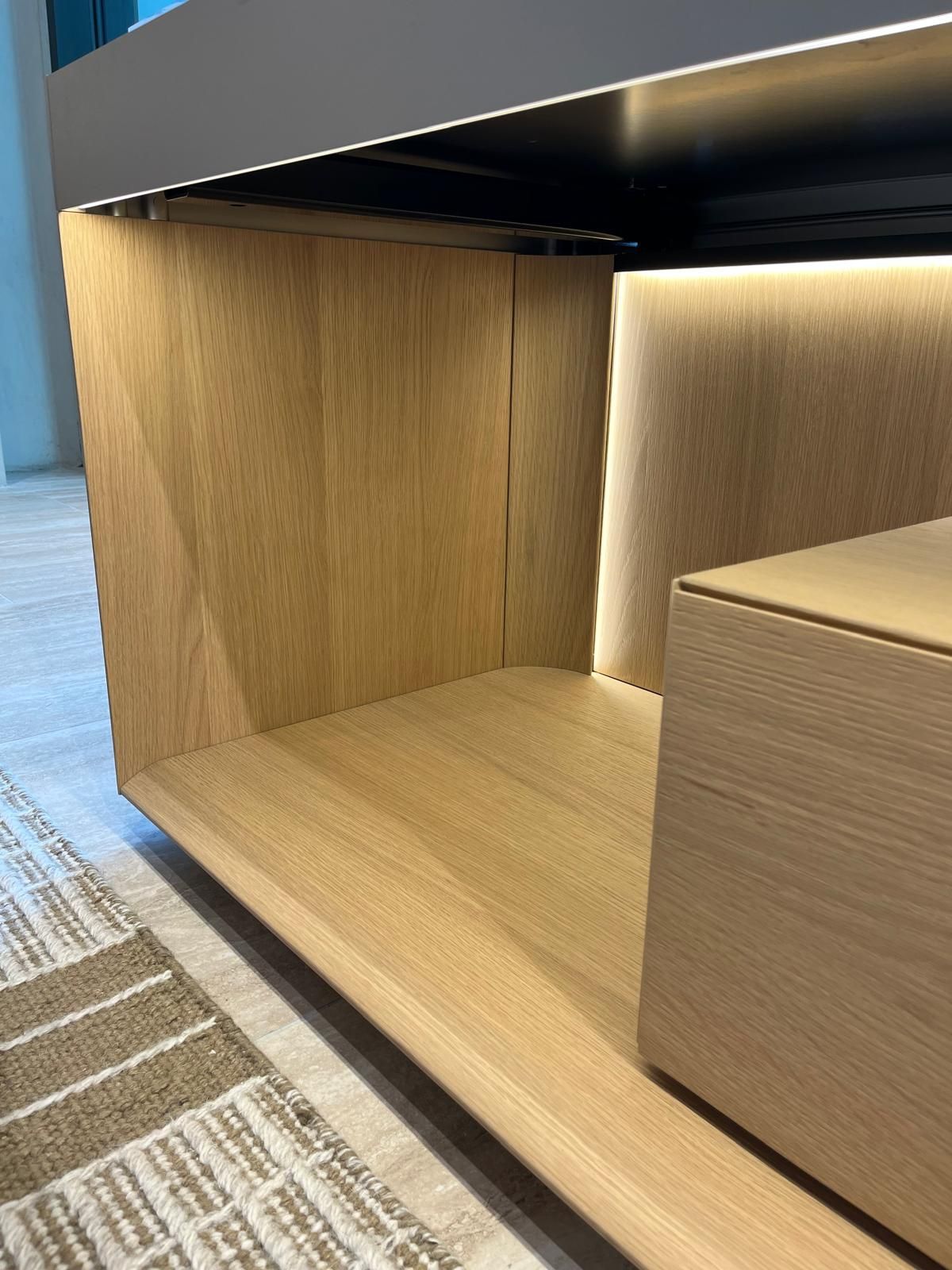 Living Box ist ein vielseitiges und kompaktes Möbelstück, das als Mittelpunkt jedes Wohnzimmers konzipiert ist. Es verbirgt elegant seinen Innenraum und schafft private Stauräume, ohne dabei seine raffinierte Ästhetik zu beeinträchtigen. Für einen zusätzlichen Hauch von Eleganz verfügt der Innenraum über eine integrierte LED-Beleuchtung und zwei zentrale Schubladen in Sunrise-Eiche-Optik. Abmessungen: H 61 cm, B 330 cm, T 61 cm.