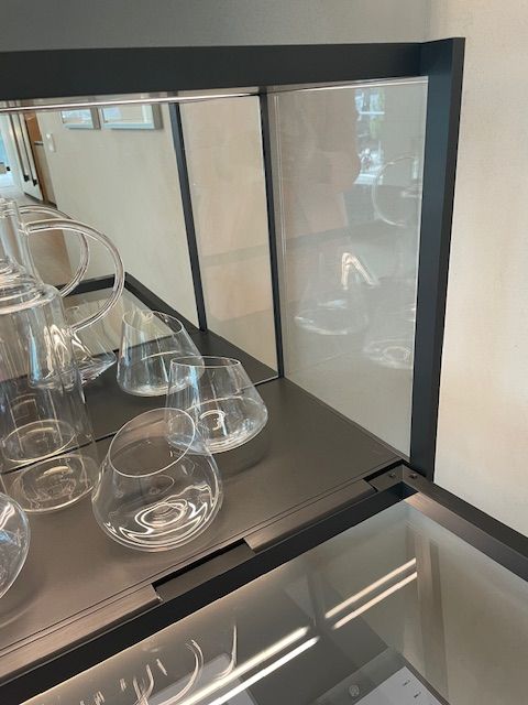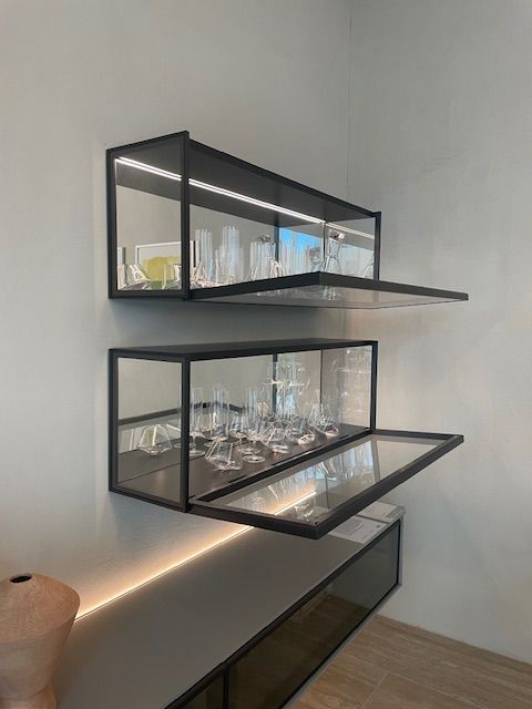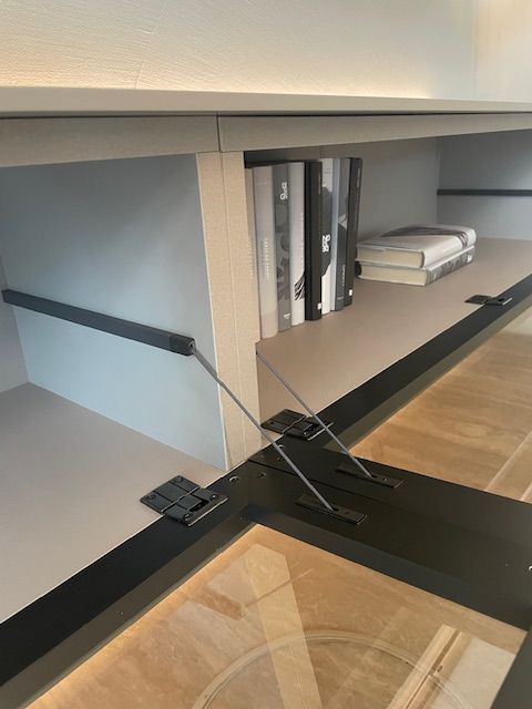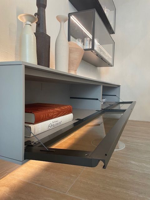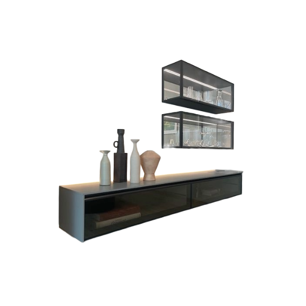 Das Wohnsystem Pass-Word Evolution wurde für moderne Wohnungen entwickelt, in denen sich das Design weiterentwickelt, um neue Möglichkeiten des Wohnens und der Raumgestaltung zu bieten. Die Komposition vereint mehrere gestalterische und funktionale Merkmale und kombiniert massive und leere Räume, um extreme Gestaltungsfreiheit und eine originelle Ausdruckskraft zu gewährleisten. Dieser Vorschlag umfasst zwei wandmontierte Einheiten mit Klapptüren und Beleuchtung, Abmessungen H 310 x B 111,5 x T 40 cm, sowie zwei wandmontierte Einheiten mit Klapptüren, verspiegelten Rückwänden und Beleuchtung, Abmessungen H 38 x B 112 x T 27,8 cm. Die beiden Vitrinen und das niedrige Sideboard sind mit Beleuchtung ausgestattet. Die Türen bestehen aus zinnfarbenen Metallrahmen, lackiertem Glas und Spiegeln, was dem System ein elegantes, zeitgemäßes und vielseitiges Aussehen verleiht, das sich ideal zur Aufwertung jedes Wohnraums eignet. Um die Sicherheit und Qualität des Produkts zu gewährleisten, ist eine professionelle Montage erforderlich. Dieser Service ist nicht im Preis inbegriffen und wird separat in Rechnung gestellt.