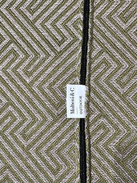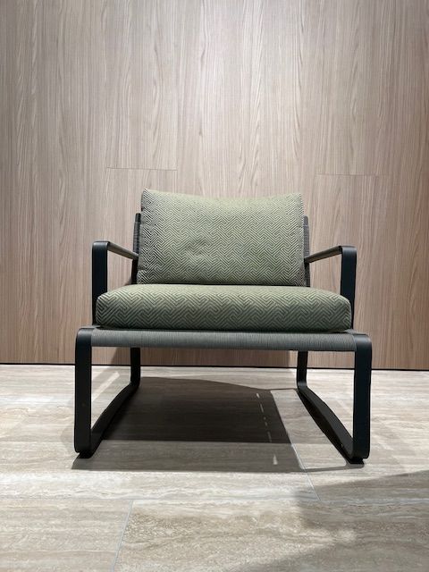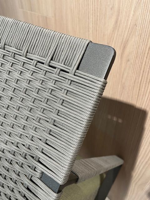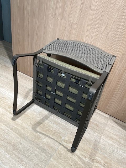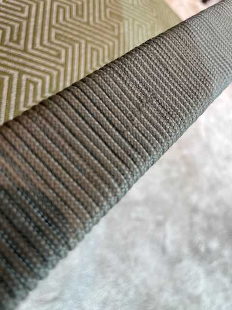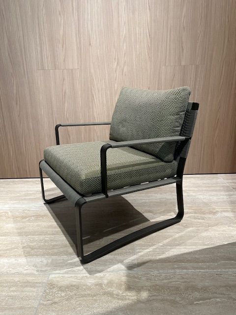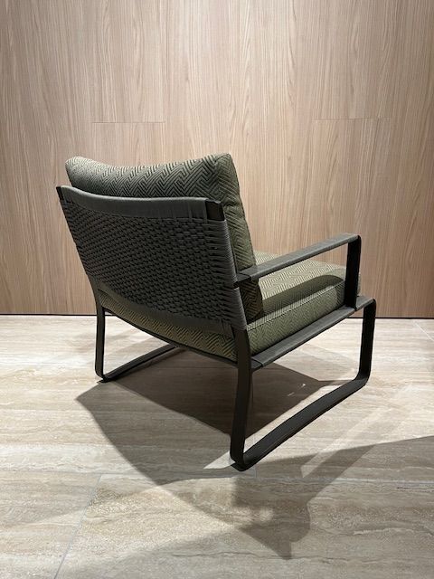 Der Sessel Phoenix, entworfen von Vincent Van Duysen, verkörpert die perfekte Balance zwischen zeitgenössischer Ästhetik und raffinierter Handwerkskunst. Das leichte und dennoch solide Gestell besteht aus brüniertem Metall, während Sitzfläche und Rückenlehne durch handgewebtes Polypropylenseil aufgewertet werden. Die gepolsterten Kissen garantieren einen hohen Komfort und sind mit dem Stoff Elisir OE 2043 in eleganten Olivgrün- und Beigetönen bezogen, die perfekt mit dem olivgrünen Seil harmonieren, das den Rahmen umwickelt. Dieser Sessel mit seinem schlichten und raffinierten Design eignet sich perfekt für Innenräume und überdachte Außenbereiche und passt sich dezent an moderne und raffinierte Einrichtungen an. Die Armlehne weist kleine Beschädigungen auf, wie auf dem Foto zu sehen ist, die jedoch die Funktionalität oder Stabilität des Produkts in keiner Weise beeinträchtigen. Abmessungen: H 70 cm, B 74 cm, T 80 cm.