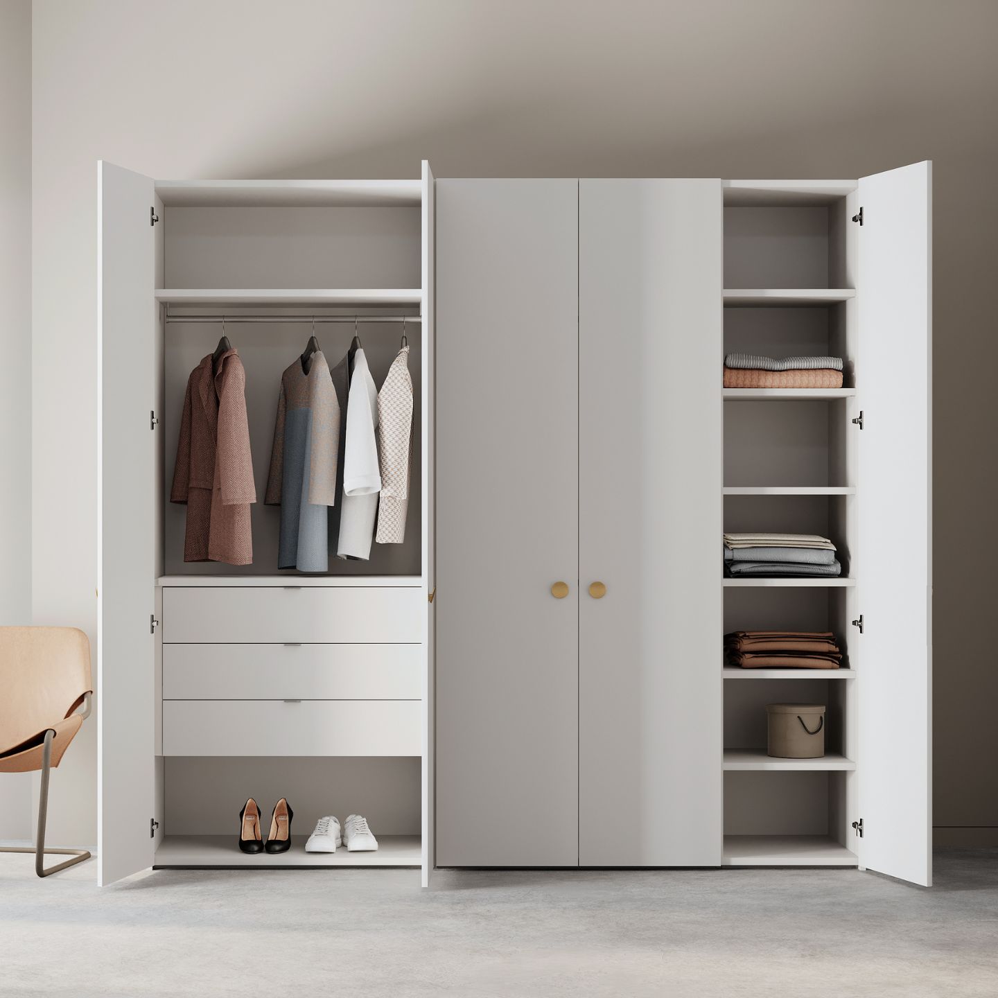 Die Griffe von Interlübke sind ein wesentliches Gestaltungsmerkmal und vollenden das Design des Kleiderschranks.